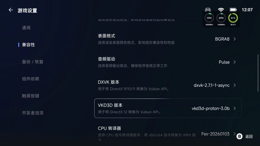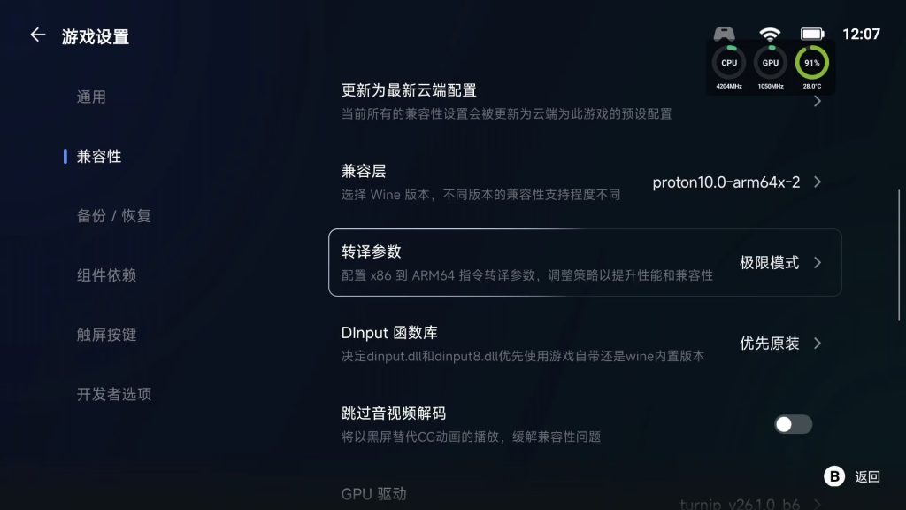 如果和我不一样的处理器进不去游戏,换兼容层和dxvk版本即可。配置高的可以尝试开中高画质,中低配建议最低画质锁30帧,或者进游戏之前模拟器系统设置中分辨率调成540P,这样可以降低功耗,减少发热,有条件搞个半导体散热背夹散热最佳!